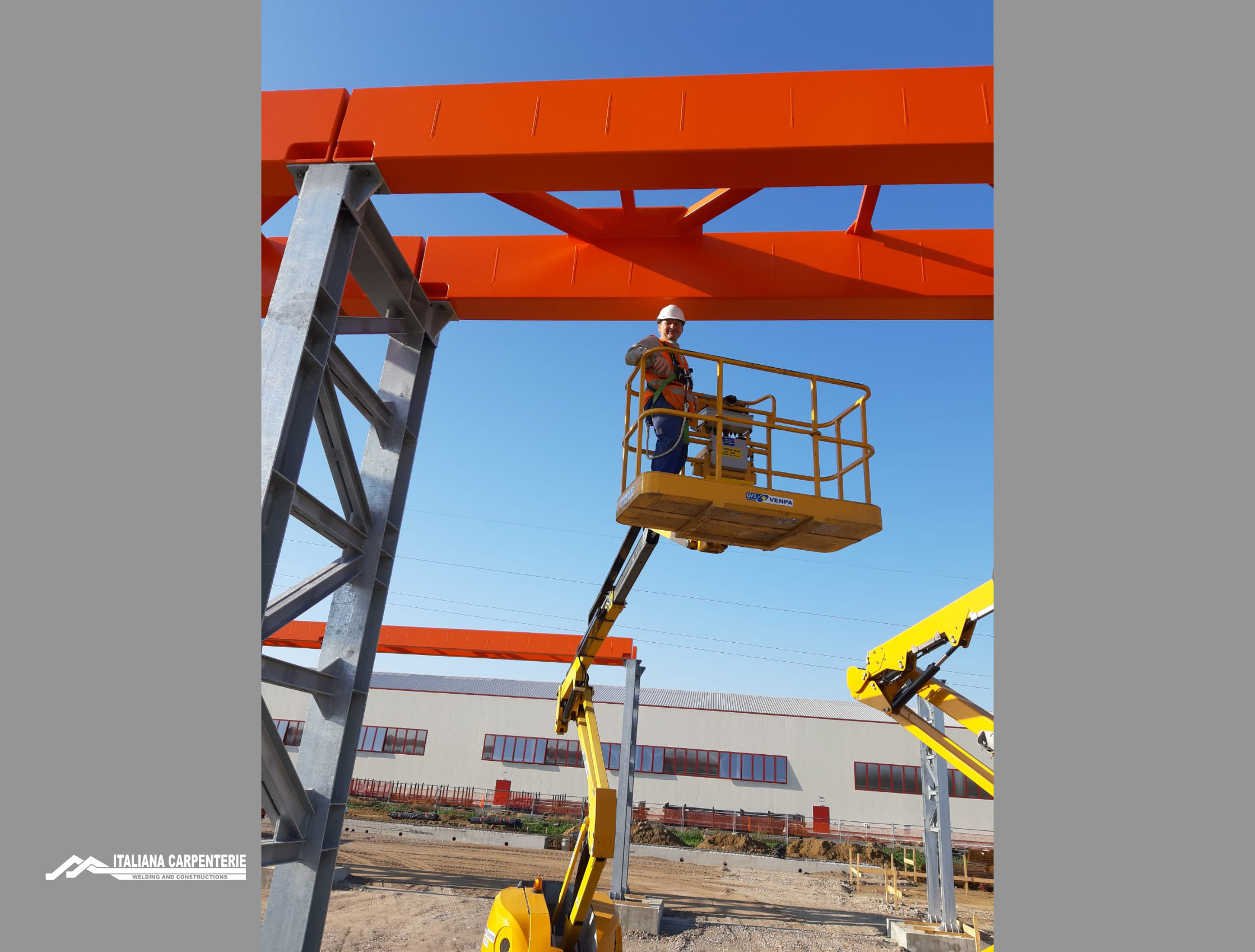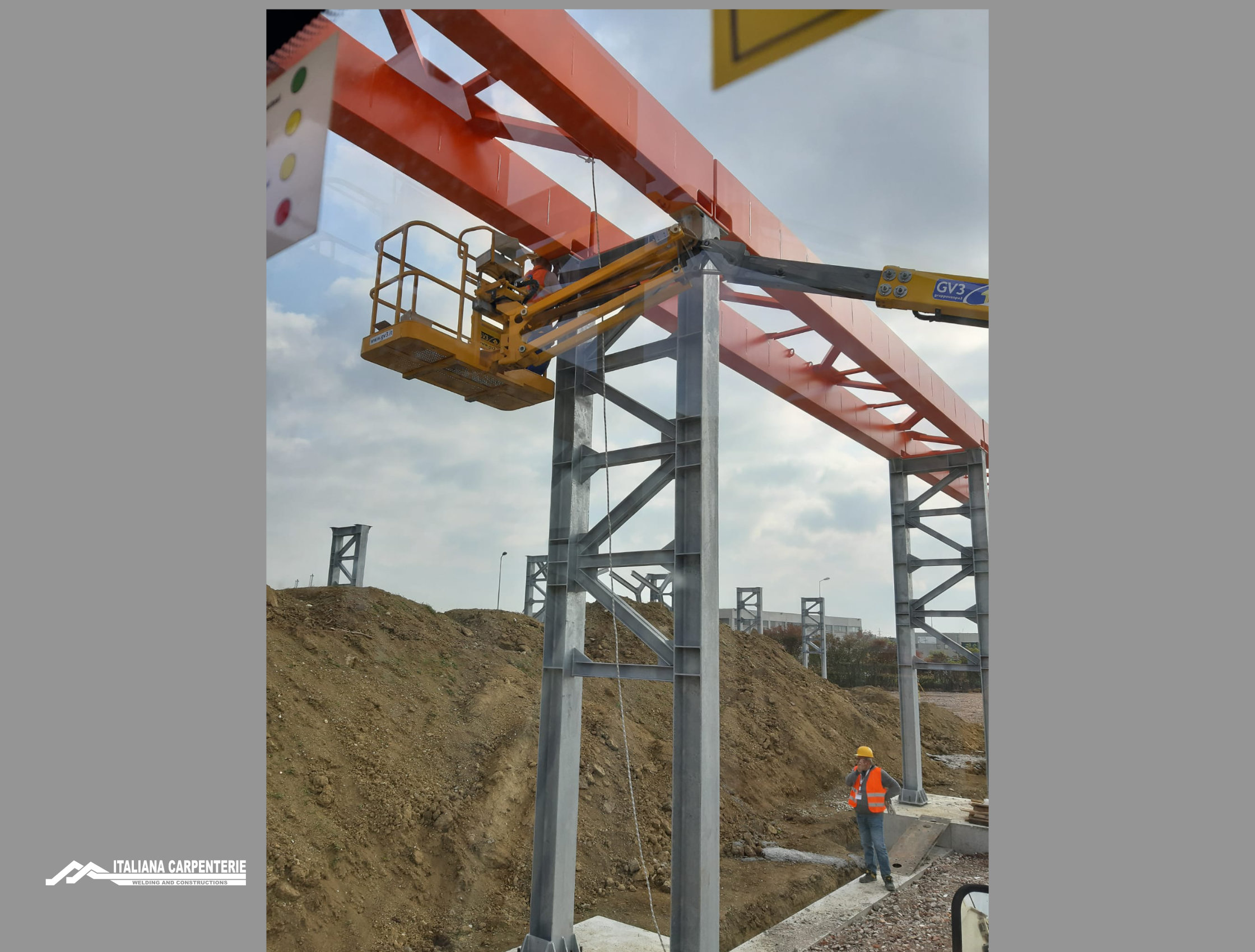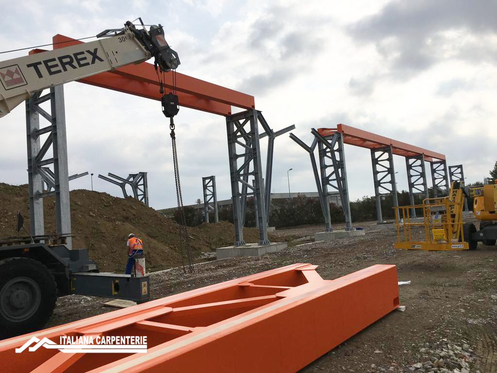 Le vie di corsa raggiungono la lunghezza di 120 mt. ed un’altezza di 8,5 mt., e mantengono una portata sempre costante nella loro interezza. Tutta la struttura è costruita in Classe EXC2 con profili di acciaio in qualità S275JR. Le vie di corsa poggiano su colonne costruite con 02 profili in HEA 280, tralicciate tra loro con profili UPN 180 e bulloneria in classe 8.8 zincata UNI 1090-2.